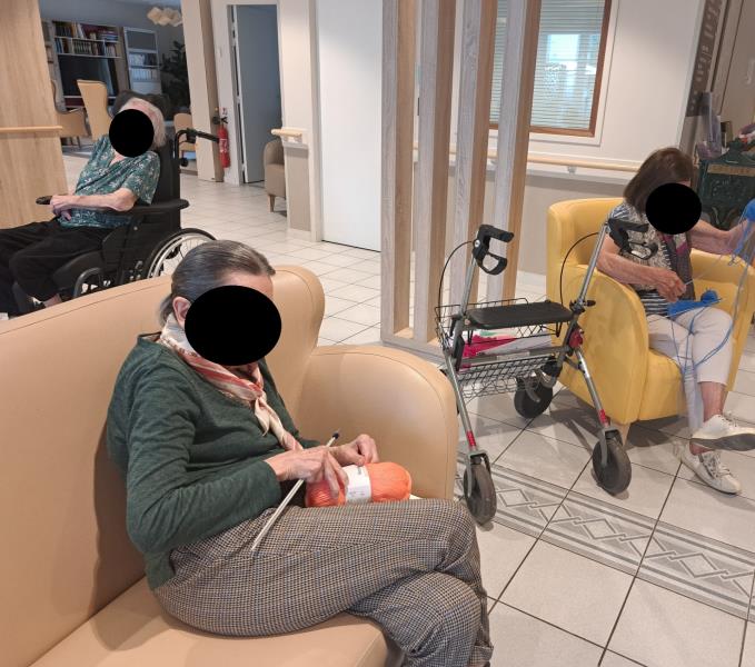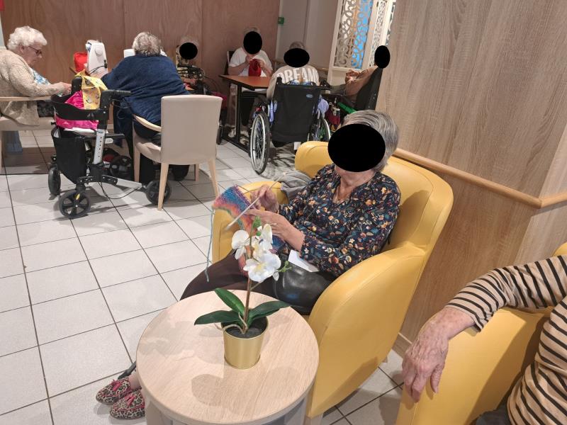 Tous les mardis , les tricoteuses et couturières (résidents, famille, bénévole et collaborateurs) se retrouvent au CLUB TRICOT et laissent "parler" leurs aiguilles, laines, machines à coudre et "langues" 😃. On papote tout en s'appliquant.