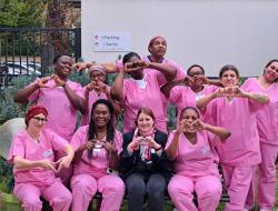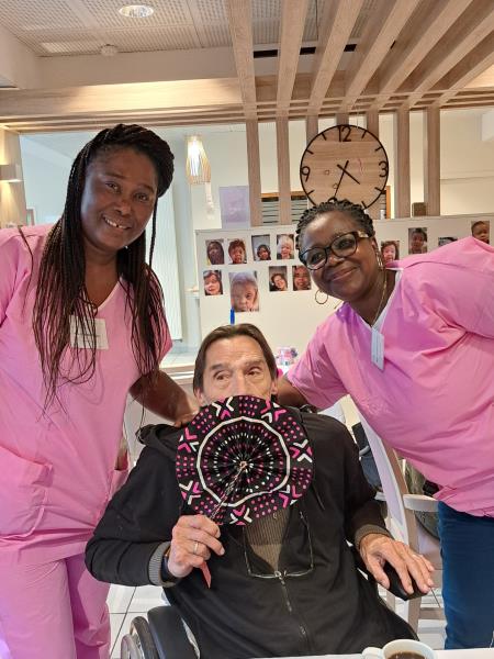 L'équipe du jour, les résidents, familles et bénévoles ont mis dans leur tenue/habit une touche de Rose.